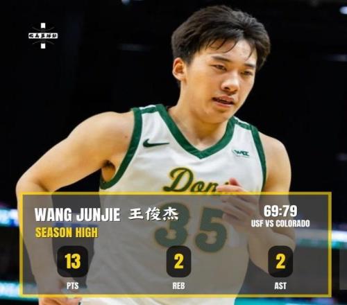 王俊杰加盟的是NCAA的旧金山大学队,在最新一场比赛当中,他首发出战26分钟,命中3个三分拿到13分2板2助,数据很全能,越来越体现出自己小詹皇的身份了。尤其是外线的三分投射非常精准,基本上队友传球,他就不怎么会浪费机会,这么激烈的对抗之下,能够砍下13分的最新高分,已经足以证明王俊杰的能力了。