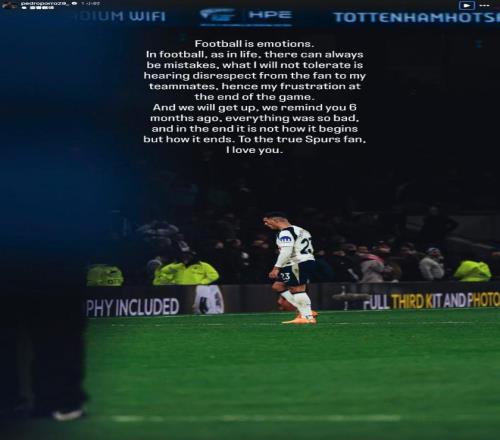 今日,波罗写道:“足球就是情绪。在足球中,就像在人生中一样,总会有失误,但我不能容忍的是听到球迷对我队友的不尊重,这也是我在比赛结束时感到沮丧的原因。我们会重新站起来。还记得六个月前吗?一切都那么糟糕,但最终重要的不是如何开始,而是如何结束。献给真正的热刺球迷们——我爱你们。”