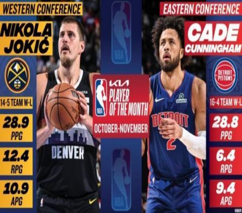 NBA官方公布了本赛季10-11月东西部月最佳球员,掘金球星约基奇和活塞球星康宁汉姆分别当选。约基奇在这段时间里率领掘金取得了14胜5负的战绩,场均可以得到28.9分12.4篮板10.9助攻的大号三双。康宁汉姆在这段时间里率领活塞取得了16胜4负的战绩,场均可以得到28.8分6.4篮板9.4助攻。