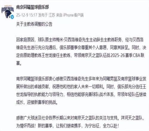 南京同曦是在12月9日下午15:17官宣贝西洛维奇下课的消息的,按照南京同曦的说法,贝西洛维奇因为家庭原因,同意其辞职。同时宣布了辽宁男篮昔日悍将王世龙接手,成为南京同曦新的主教练。
