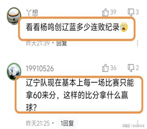 目睹辽宁队如今的悲惨现状,辽宁球迷也是在网络平台发表观点,矛头直指球队主教练杨鸣。“杨明吃了4年老本,但忘了培养年轻人,这不就是现实版的坐吃山空嘛”;“看看杨鸣创辽篮多少连败纪录”;“辽宁队现在基本上每一场比赛只能拿60来分,这样的比分拿什么赢球?”;“以前的辽宁队打比赛是从从容容游刃有余!现在是匆匆忙忙连滚带爬”;“杨鸣吃了郭士强四五年红利,终于原形毕露了”,“坐吃山空”……