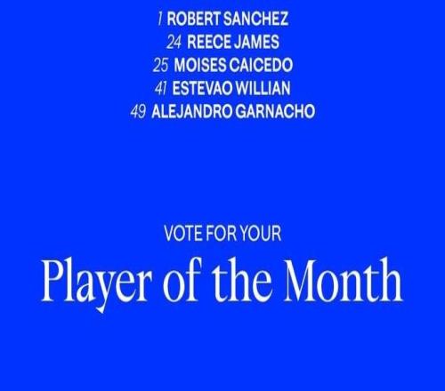 蓝军月最佳候选:桑切斯、詹姆斯、凯塞多、埃斯特旺、加纳乔 -