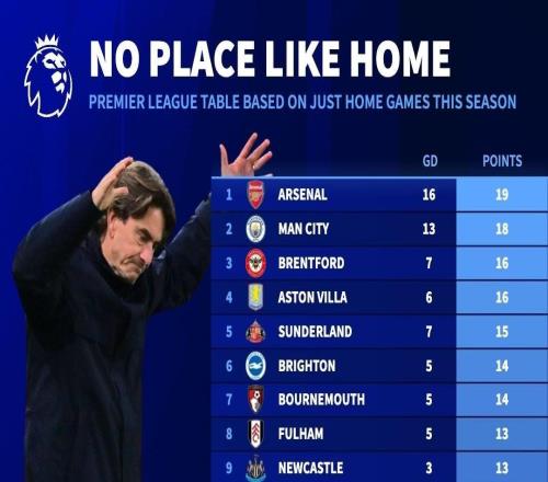 本赛季英超主场战绩榜:阿森纳19分居首,热刺5分倒数第二 -