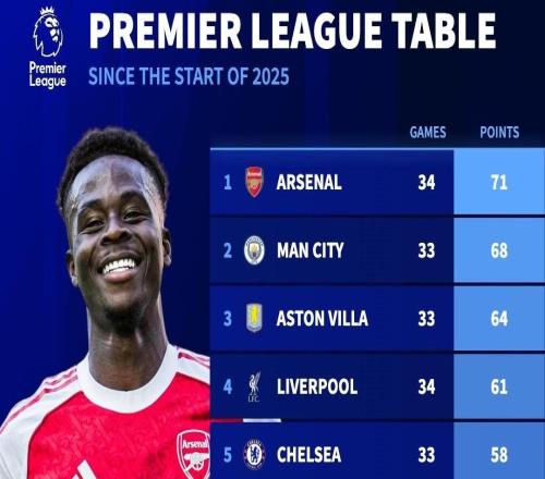 2025年英超积分排行:枪手71分居首,曼城68分第二,维拉第三 -